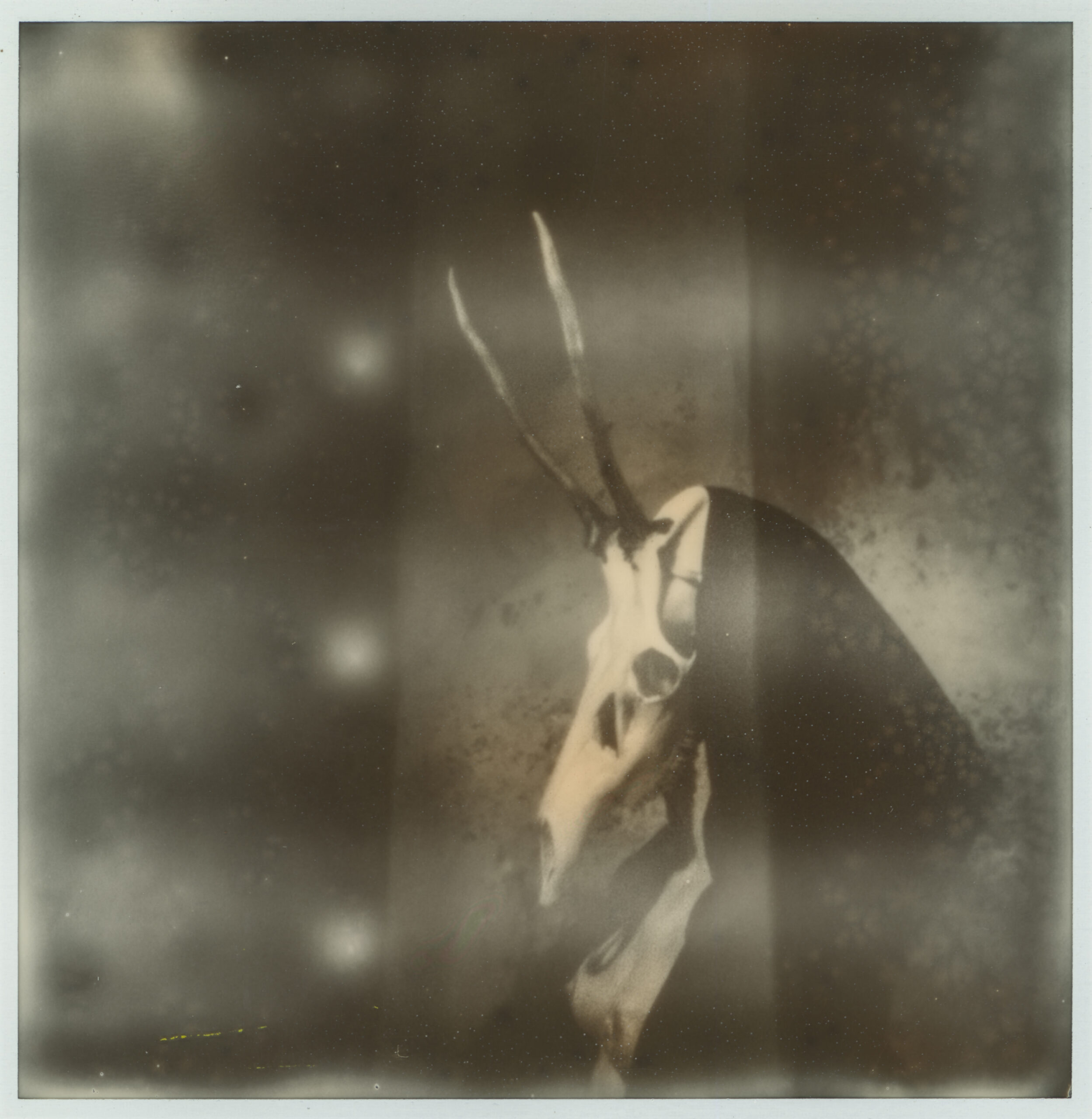 Gemaakt met een zelfgemaakte pinholecamera en overtijdse Impossible-film, toont dit beeld een dierlijk restant als verschijning eerder dan als document. De verouderde emulsie laat het beeld ontstaan en vervallen tegelijk. Wat zichtbaar wordt is geen object, maar een spoor van een lichaam, een reliek van licht, drager van tijd, stil en kwetsbaar, een moment van aanwezigheid en verdwijning
